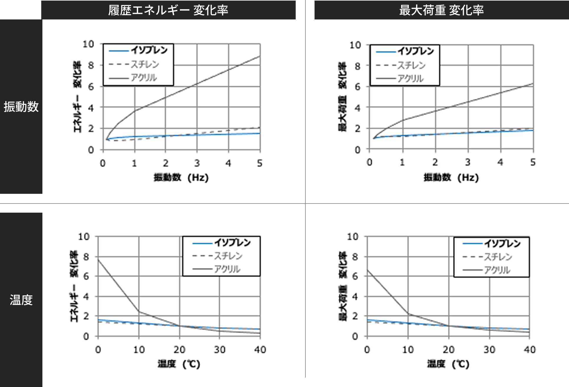 またイソプレン系材料は振動数依存・温度依存が低く、設計しやすい特長もあります。