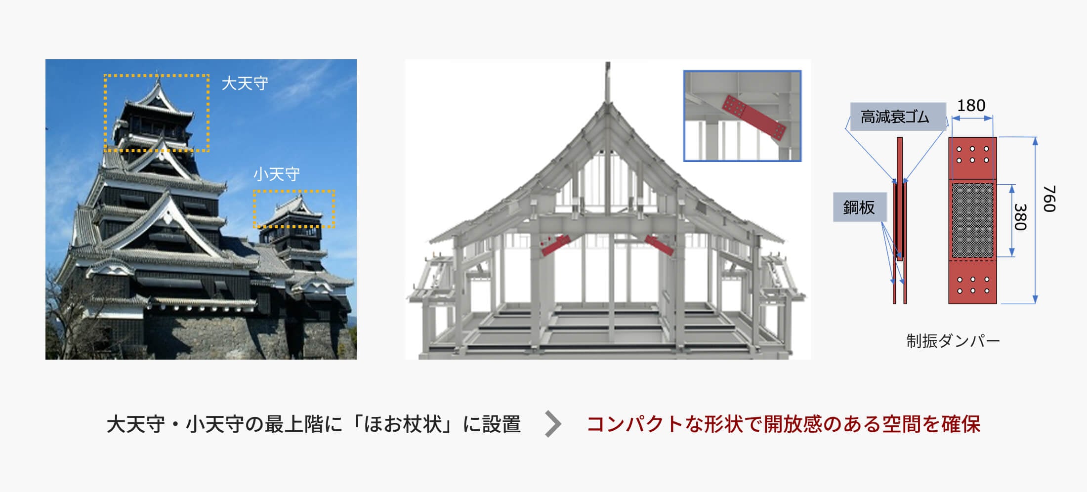 2016年の熊本地震により大きな被害を受けた熊本城天守閣の耐震改修工事において、最上階に住友ゴムの制振ダンパーが採用されました。コンパクトかつ高性能な高減衰ゴムダンパーを設置することにより省スペース化が図れ開放感のある空間を提供しています。