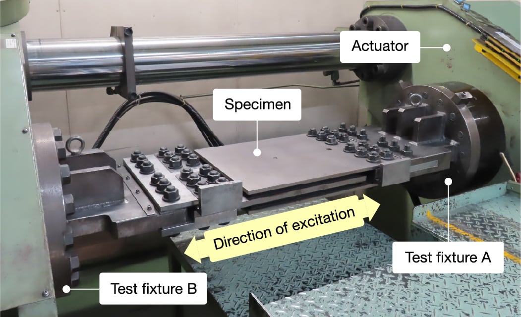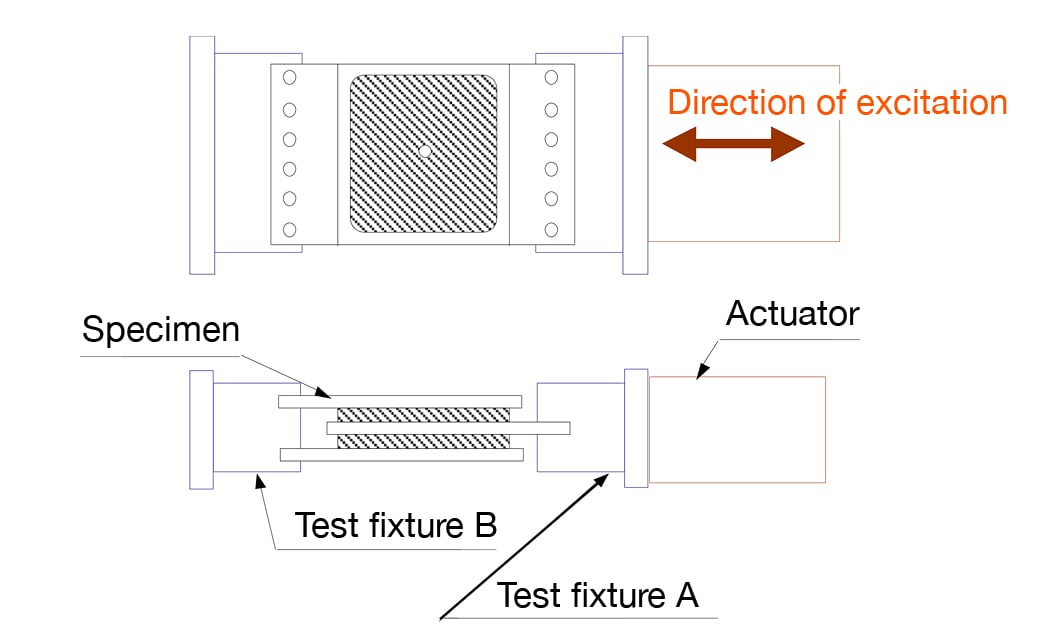 The viscoelastic damper unit is mounted on the testing machine, and a predetermined displacement is applied repeatedly for four cycles. The load-displacement curve is obtained using the displacement gauge and load cell inside the testing machine.