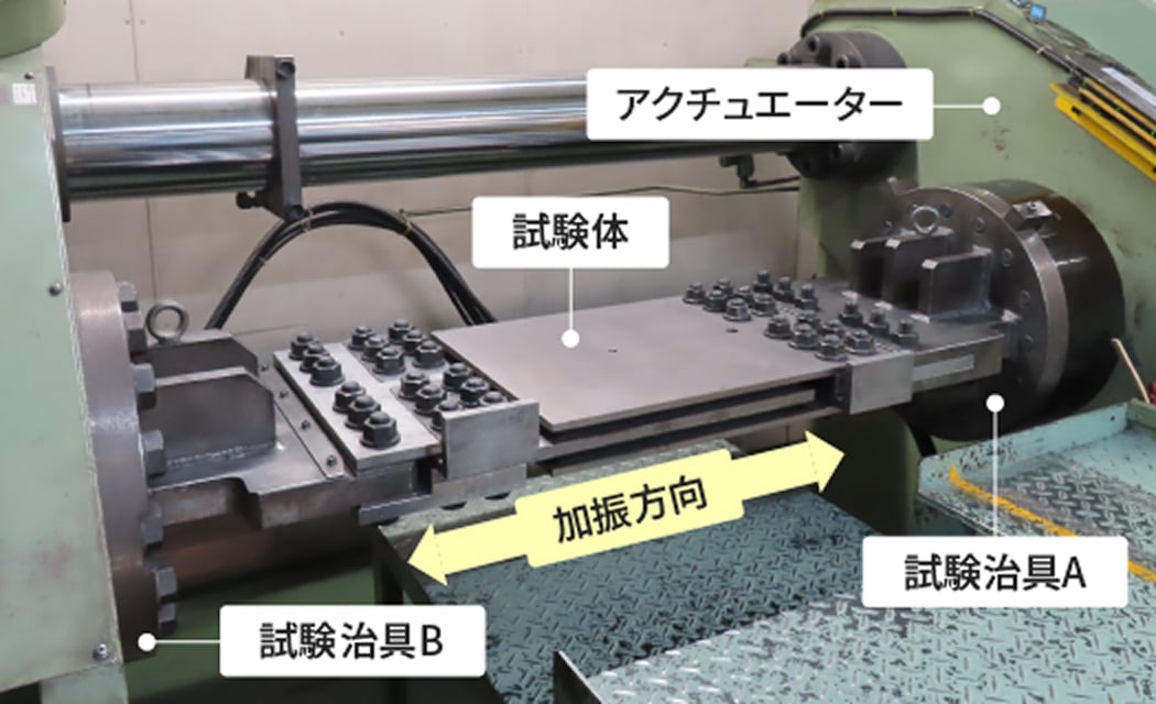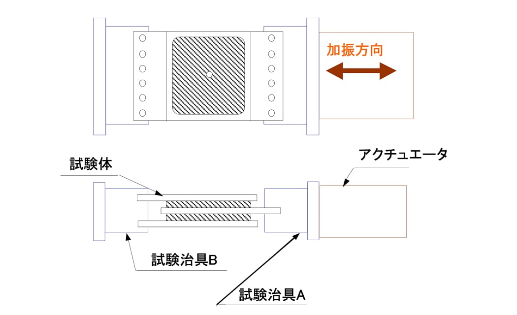 粘弾性ダンパーユニットを試験機に取り付け、所定変位を4サイクル繰り返し与え、試験機内部の変位計およびロードセルにより荷重変位曲線を得る。