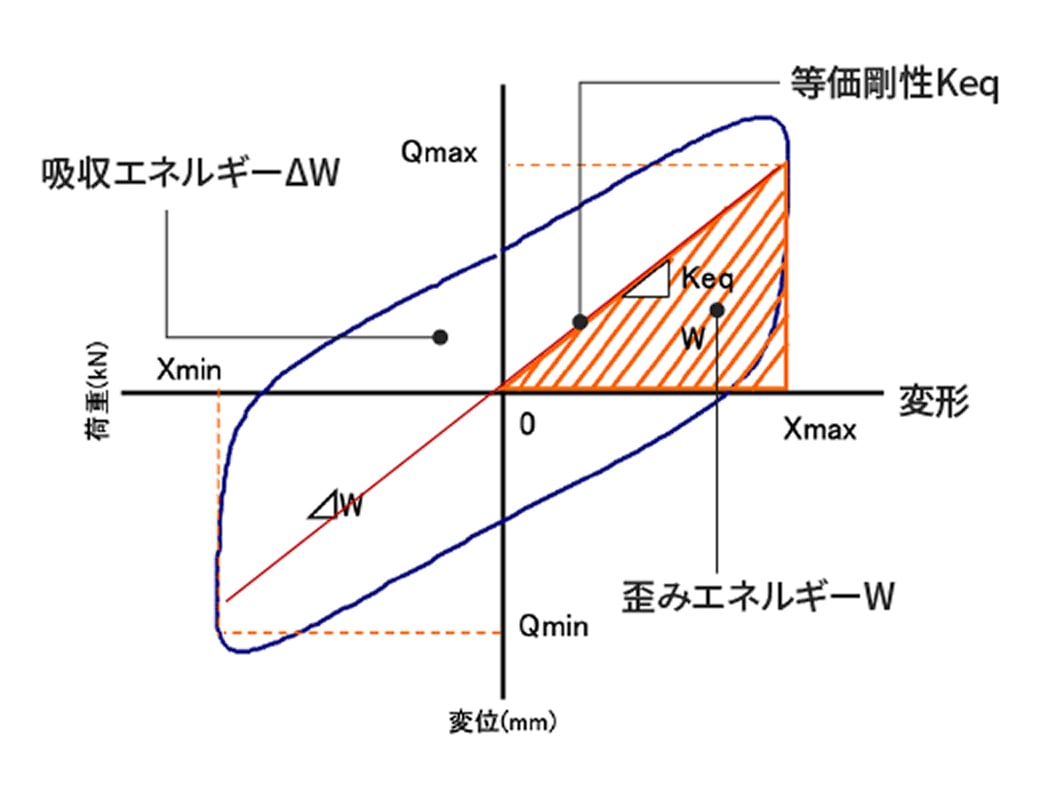 - 等価剛性 \(Keq\)、吸収エネルギー \(ΔW\)、歪みエネルギー \(W\)